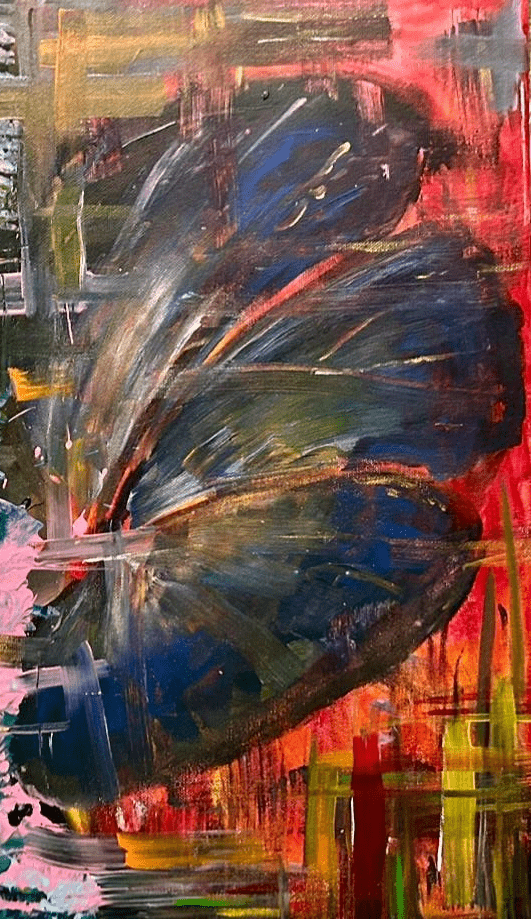 dit werk heb ik gemaakt na een periode met zware artblock. ik had viooltjes als inspiratie genomen en heb vanaf daar steeds verder geabstraheerd naar dit uiteindelijke werk